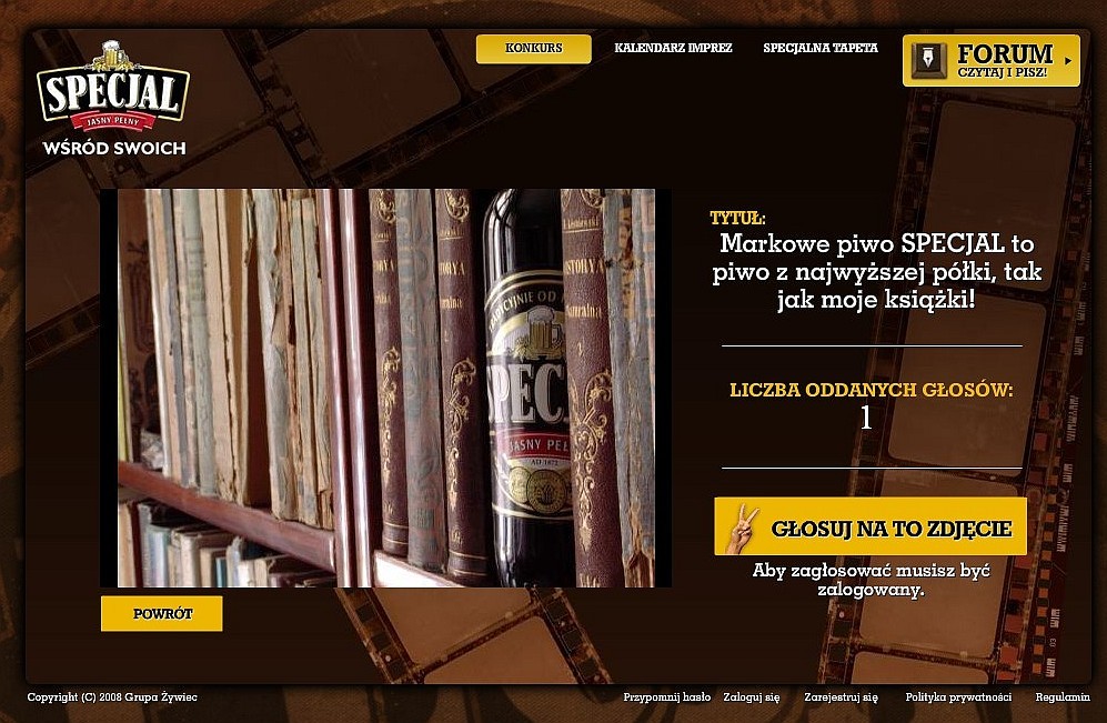 Firma "Żywiec Sprzedaż i Dystrybucja Sp. z o.o." ogłosiła konkurs pod nazwą „Specjal – fotokonkurs”. Przedmiotem Konkursu było wyłonienie najbardziej zaskakujących i najciekawszych zdjęć z produktem lub logotypem marki Specjal. Myślałem krótko nad tematem fotografii i gdy pojawił się w mojej głowie obraz zdjęcia, nie wiem skąd - ale widziałem, że konkurs wygram! Potem zabrałem się za wykonanie zdjęcia. Wykonałem 5 ujęć i chyba sam diabeł podpowidział mi żebym wysłał oprócz mojego faworyta jeszcze jedno ujęcie i coś mi mówiło, że to może być to!